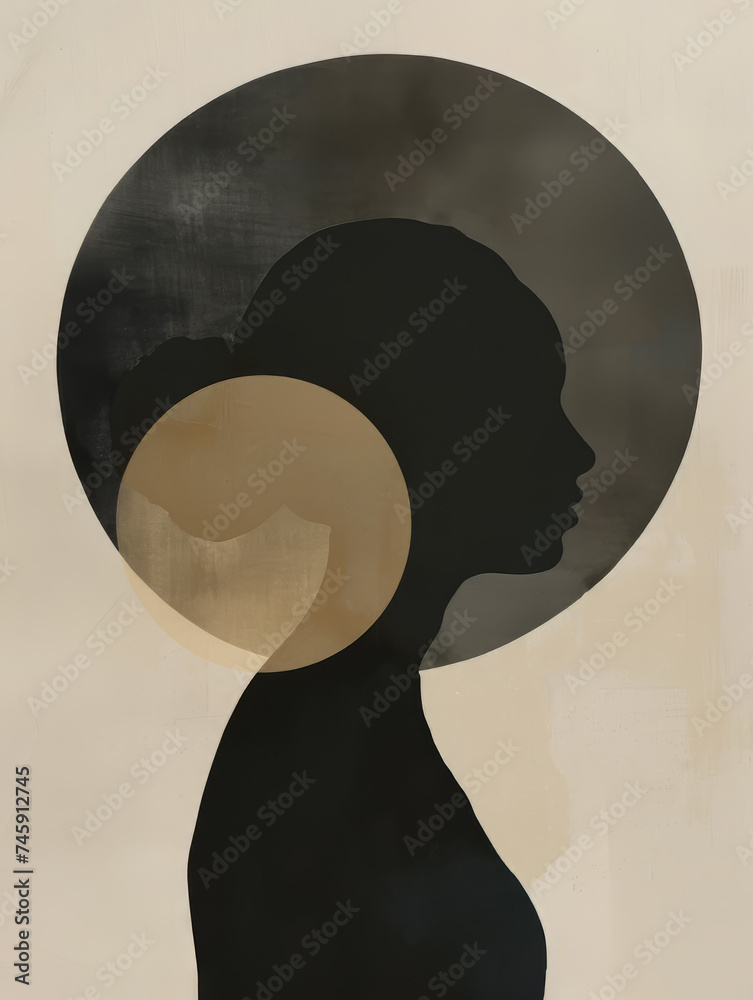 Tło obrazu stanowi duże, czarne koło, które nie tylko podkreśla główny motyw, ale także wprowadza harmonię i balans w całą kompozycję. Czerń koła stanowi mocny kontrast w stosunku do bardziej stonowanych odcieni twarzy, która może być utrzymana w odcieniach beżu, brązu czy szarości, co dodaje obrazowi elegancji i subtelności. Ta kombinacja kolorów i form tworzy atmosferę spokoju, ale również wprowadza elementy dynamizmu i głębi.