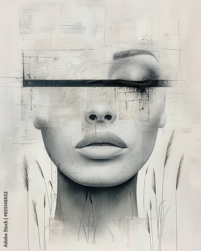 Abstract Neo-Surrealist Art Ethereal Woman's Face Merged with Nature Elements, Featuring Bold... #855148852